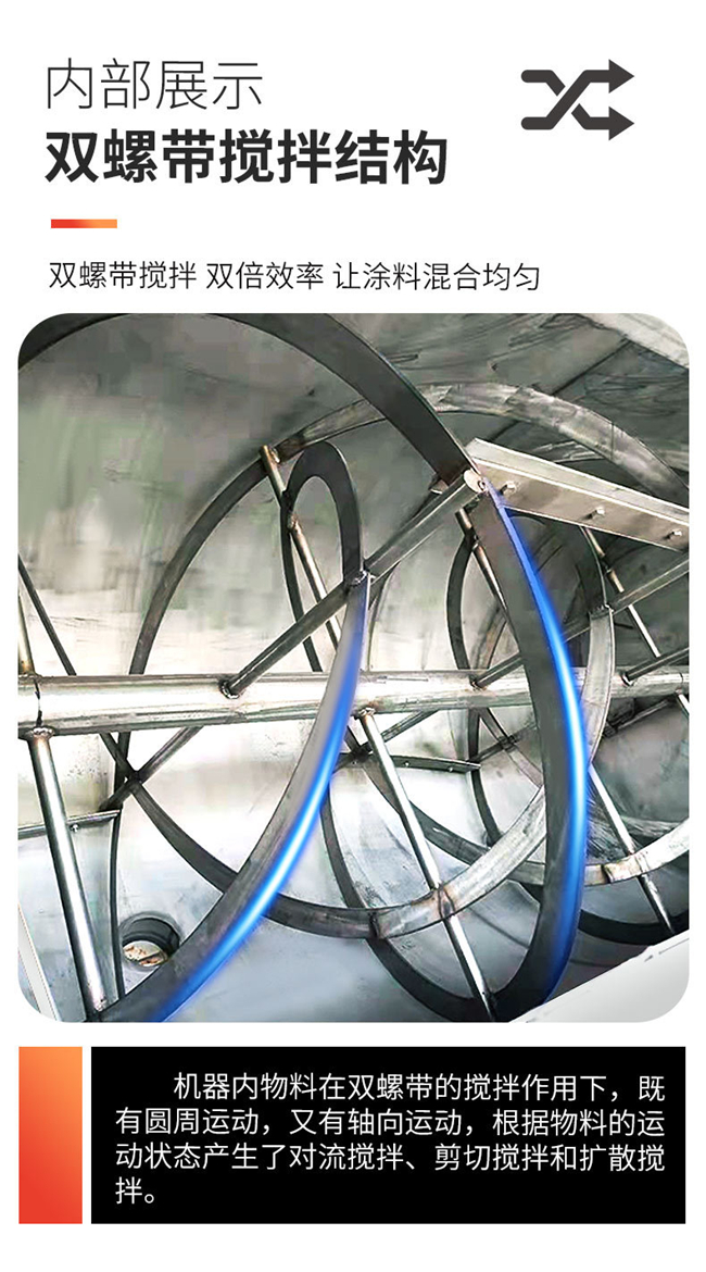 臥式螺帶混合機傳動主軸上布置雙層螺旋葉片,內(nèi)部螺旋將物料向外側(cè)輸送,外部螺旋將物料向內(nèi)部聚集。物料在雙層螺旋帶的對流運動下,形成一個低動力高效的混合環(huán)境。安裝于攪拌軸上的內(nèi)外徑螺旋帶動桶體內(nèi)物料,使攪拌器在桶體內(nèi)最大范圍翻動物料。攪拌裝置工作時內(nèi)螺旋帶動靠近軸心處物料做軸心旋轉(zhuǎn),軸向由內(nèi)至兩側(cè)推動,外螺旋帶動靠近桶壁物料做軸心旋轉(zhuǎn),軸向由兩側(cè)至內(nèi)推動,本混合物料能夠在較短時間內(nèi)均勻混合。